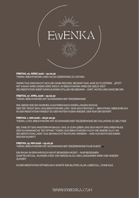 Bei den Ewenka Events öffnen wir das Herz mit einer Kakaozeremonie, verbinden uns mit unserem Körper durch Breathwork und finden in einer geführten Meditation zurück zu uns selbst. Jedes Treffen dauert – je nach Thema – 1 bis 2 Stunden und ist abgestimmt auf das Datum, die Mondphase oder die Jahreszeit. Wir tauchen gemeinsam in die Energien des Moments ein – wir spüren, atmen, fühlen und verbinden uns. So entsteht ein Raum, in dem wir als Community zu einem Eins werden – getragen von Achtsamkeit, Präsenz und dem Rhythmus der Natur.